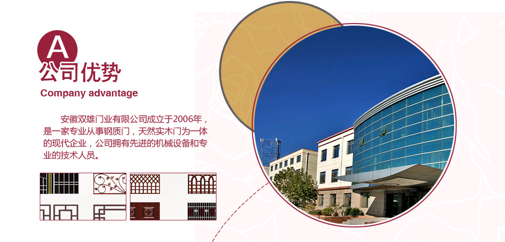 安徽六安雙雄門業(yè)有限公司成立于2006年,是一家專業(yè)從事鋼質(zhì)門,天然實(shí)木門為一體的現(xiàn)代企業(yè),公司擁有先進(jìn)的機(jī)械設(shè)備和專業(yè)的技術(shù)人員,以科技為依托,以市場(chǎng)需求為導(dǎo)向,大膽創(chuàng)新追求更好,全身致力于提高門業(yè)裝飾水平。公司擁有先進(jìn)的機(jī)械設(shè)備和專業(yè)的技術(shù)人員,以科技為依托,以市場(chǎng)需求為導(dǎo)向,全力打造“雙雄”品牌門!產(chǎn)品種類繁多:金屬門(棗紅金屬門、黑底金屬門);仿銅門(紅銅門、紫銅門);真銅門(仿真銅門、真紫銅門);不銹鋼門等。公司依靠雄厚的技術(shù)力量,先進(jìn)的設(shè)備,現(xiàn)代化的管理,全力打造“雙雄”品牌,以“精益求精”“服務(wù)為先”為經(jīng)營(yíng)理念,以“專業(yè)、誠(chéng)信、熱情、周到”為服務(wù)宗旨,在消費(fèi)者中已樹起良好企業(yè)形象。