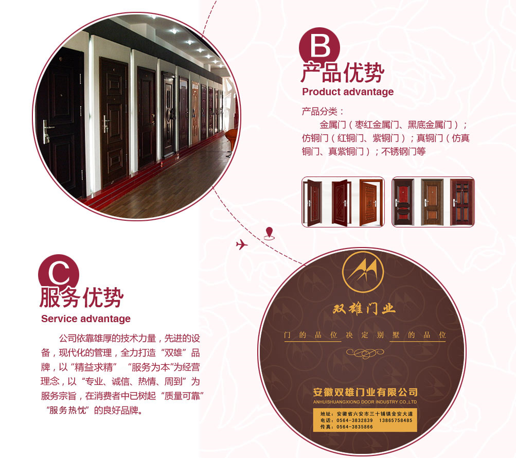 安徽六安雙雄門業(yè)有限公司成立于2006年,是一家專業(yè)從事鋼質(zhì)門,天然實(shí)木門為一體的現(xiàn)代企業(yè),公司擁有先進(jìn)的機(jī)械設(shè)備和專業(yè)的技術(shù)人員,以科技為依托,以市場(chǎng)需求為導(dǎo)向,大膽創(chuàng)新追求更好,全身致力于提高門業(yè)裝飾水平。公司擁有先進(jìn)的機(jī)械設(shè)備和專業(yè)的技術(shù)人員,以科技為依托,以市場(chǎng)需求為導(dǎo)向,全力打造“雙雄”品牌門!產(chǎn)品種類繁多:金屬門(棗紅金屬門、黑底金屬門);仿銅門(紅銅門、紫銅門);真銅門(仿真銅門、真紫銅門);不銹鋼門等。公司依靠雄厚的技術(shù)力量,先進(jìn)的設(shè)備,現(xiàn)代化的管理,全力打造“雙雄”品牌,以“精益求精”“服務(wù)為先”為經(jīng)營(yíng)理念,以“專業(yè)、誠(chéng)信、熱情、周到”為服務(wù)宗旨,在消費(fèi)者中已樹起良好企業(yè)形象。